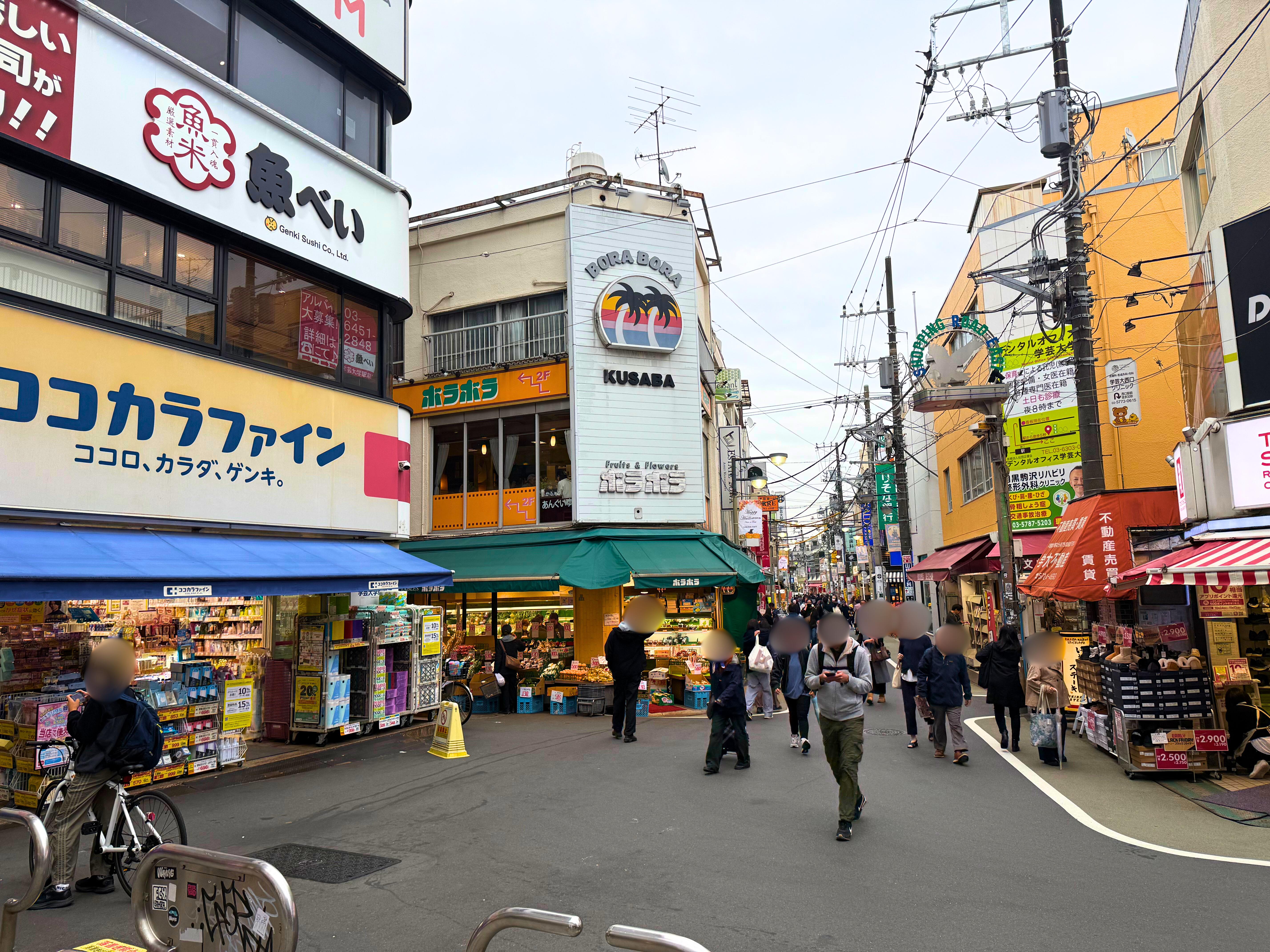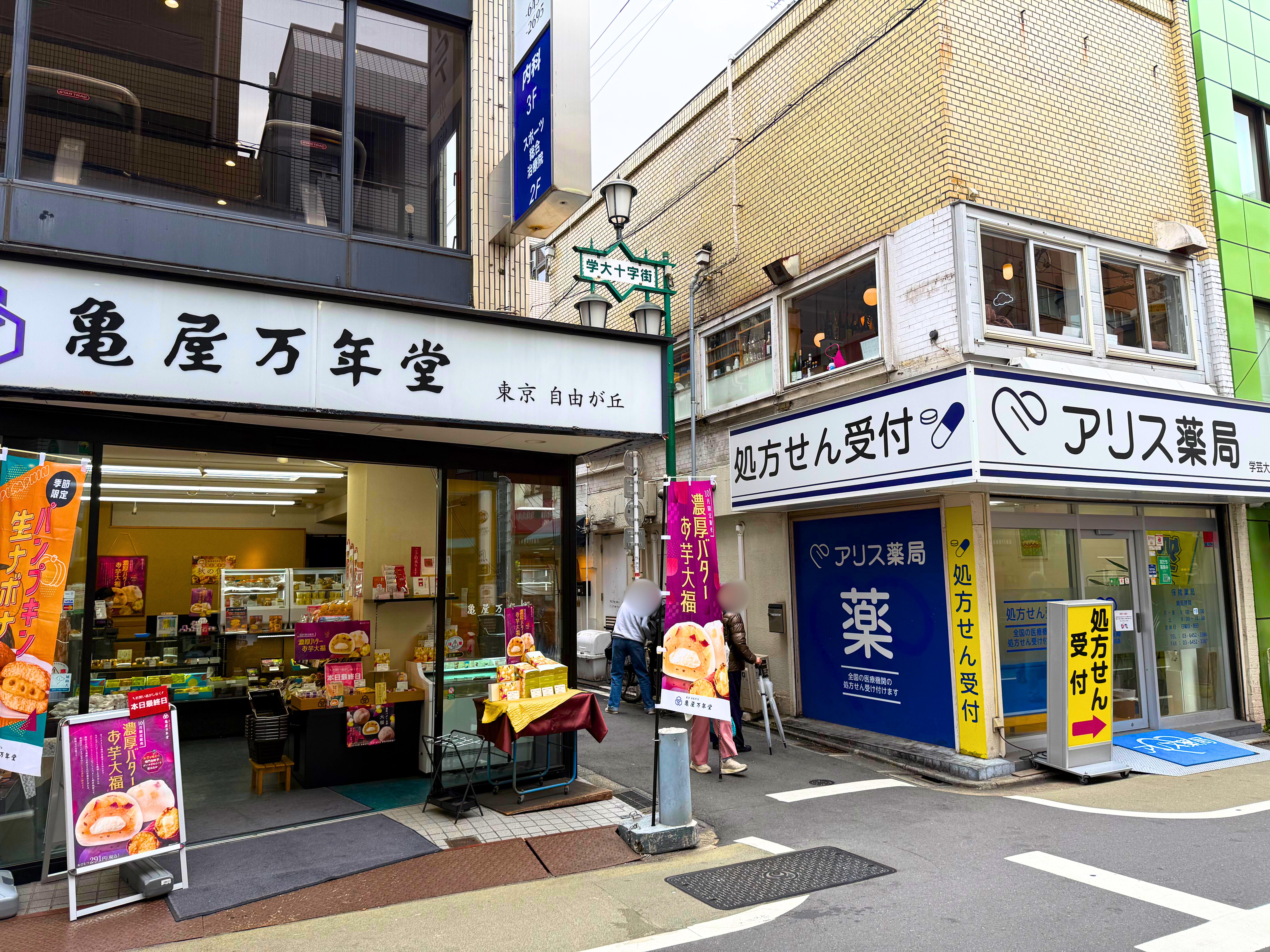 商店街を直進し、亀屋万年堂とアリス薬局の角を左に曲がります。