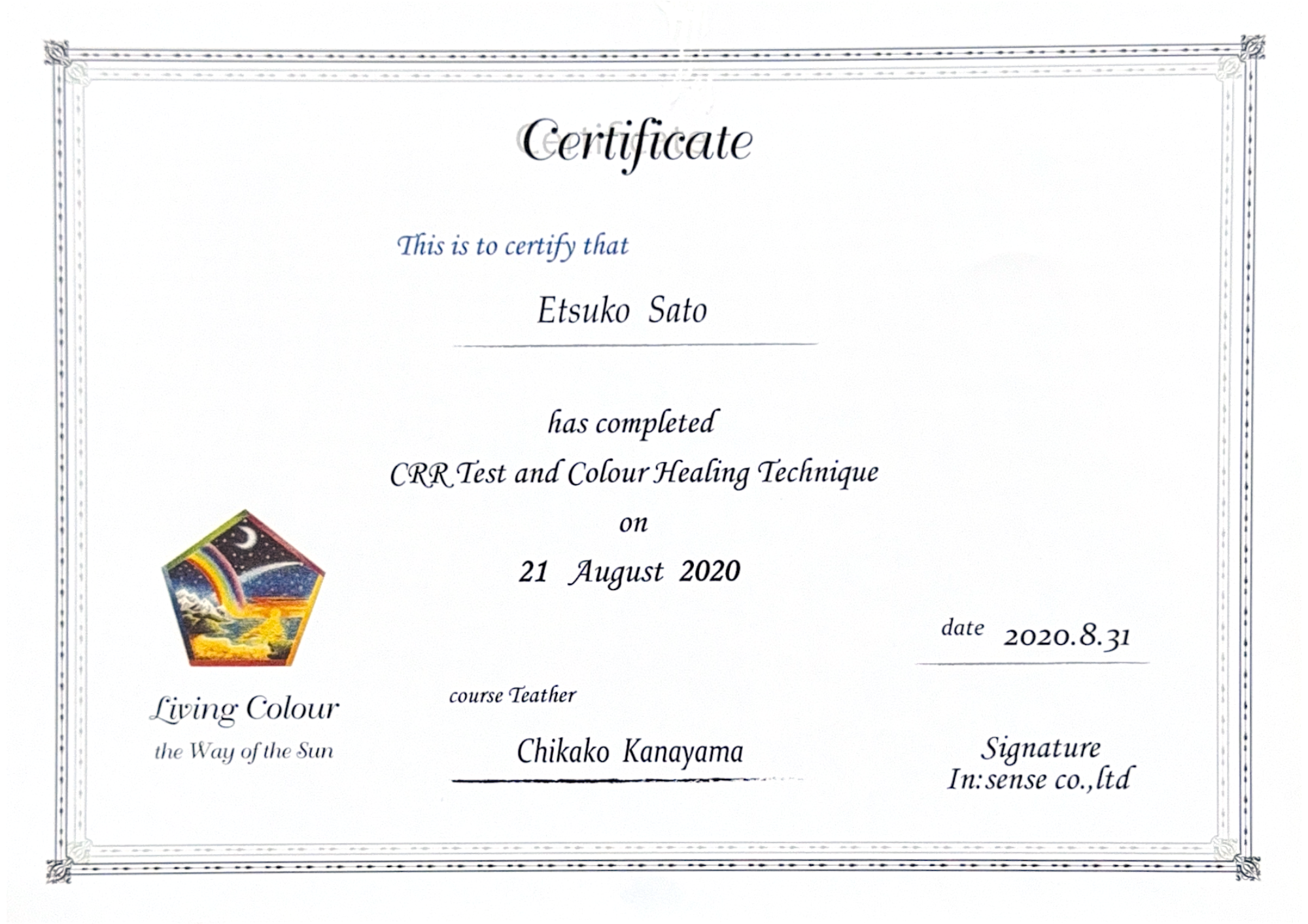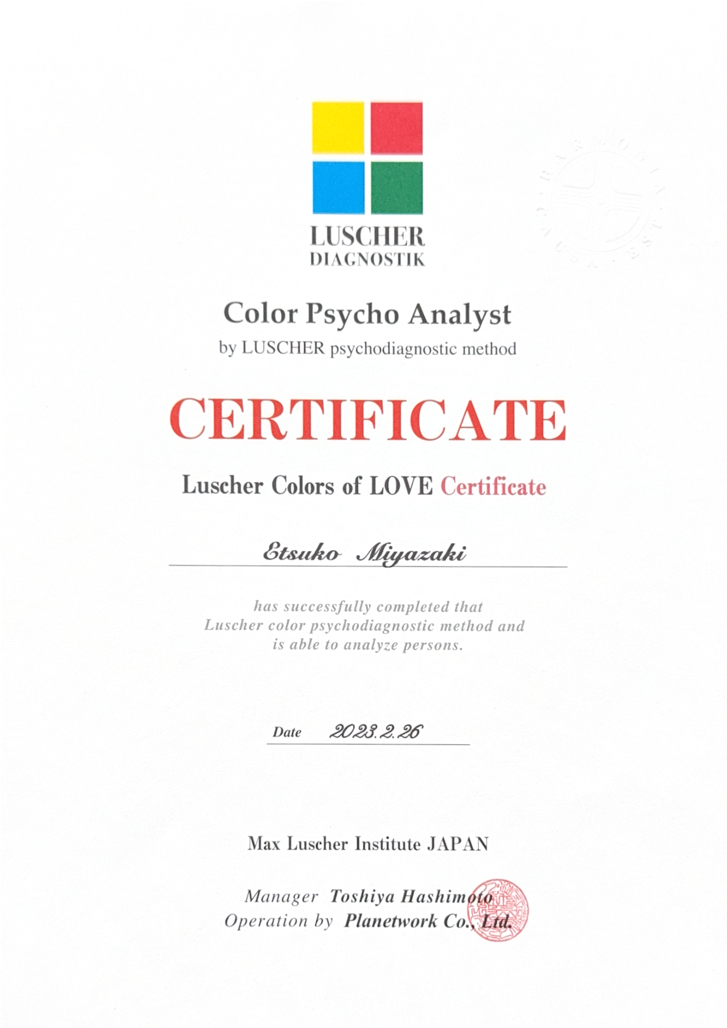 ● リュッシャー研究所日本本部認定「リュッシャーカラーズ・オブ・ラブセラピスト」